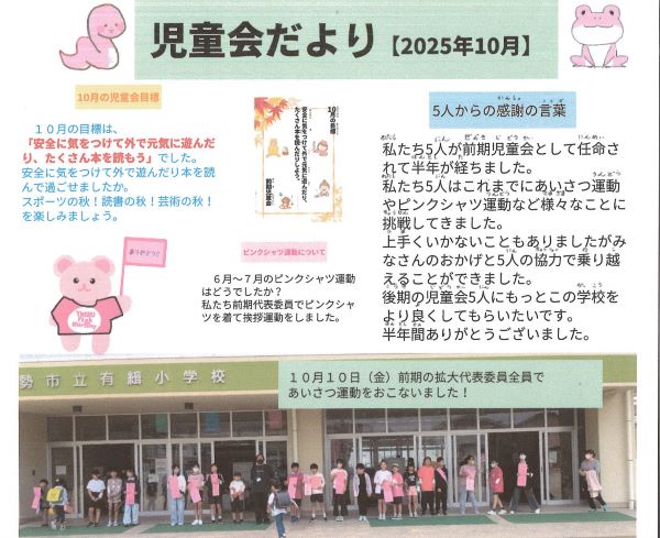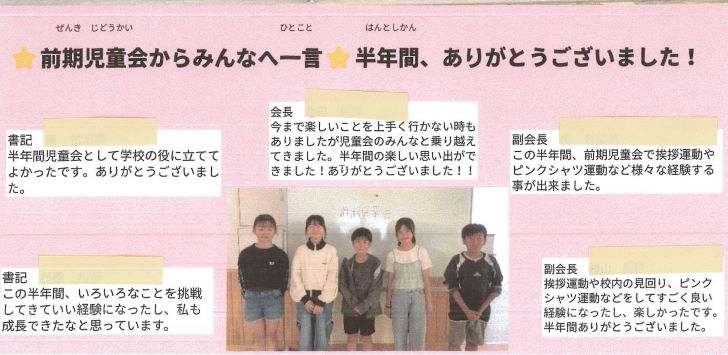 前期児童会役員が作成した前期最後の児童会だよりが発行されました。前期児童会役員は、あいさつ運動、ピンクシャツ運動など、様々なことに取り組みました。また周りも良く協力し、前期児童会役員を中心に、多くの委員で学校をよりよくする活動を行いました。児童会だよりの左画像の写真も、多くの子どもたちでの協力を表す良い写真だと思い、見ていただこうとここに掲載しました。右画像は退任の挨拶です。子どもたちにもよく話をするのですが、経験というものはとても貴重なものです。何かをやるときには、時には大変なこともありますが、やる前とやった後では、視野の広がりを含め、大きな成長が見られ、きっとやっただけのことはあります。