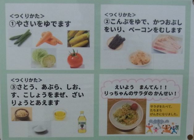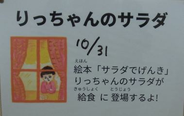 今日の給食には、その「りっちゃんのサラダ」が出ました。私は個人的には、昆布と花かつおが味のポイントだと思っています。さあ、昆布と花かつおを勧めてくれたのはどんな動物だったかな?