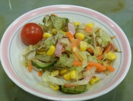 栄養教諭が作ったレシピ(職員室前に掲示してあります)を掲載します。お家でも作ってみられてはいかがですか!?子どもたち、きっと大喜びだと思いますよ!(給食ではハムではなくベーコンを使っています。ハムならそのままで大丈夫そうですし、家ではベーコンを蒸すのは難しそうなので、弱火で加熱して入れるとよいそうです。)
