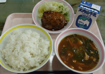 今日の主菜は、「手作りひじき入りハンバーグ」です。豚肉は三重県産、ひじきは伊勢志摩地域でとれたものです。今週は、本トピックスでも給食週間中のメニューをできるだけお伝えしたいと考えています。珍しいメニューも提供されますので、お子様がどんなものを食しているのかお楽しみに!