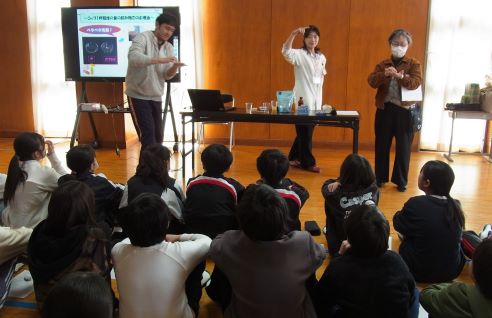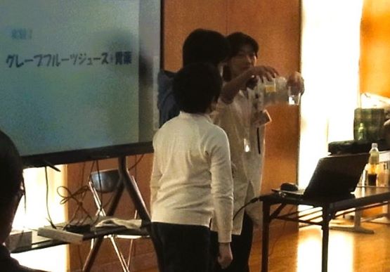 内容は、「薬剤師って何?」「薬の正しい使い方」「痛み止め服用時の注意」です。真ん中画像は、グレープフルーツジュースで胃薬を飲んだ場合の実験、右の画像は、少ない水でカプセルを飲んだらどうなるかの実験です。子どもたちは、「おー」「知らんだ!」と感嘆の声を上げていました。