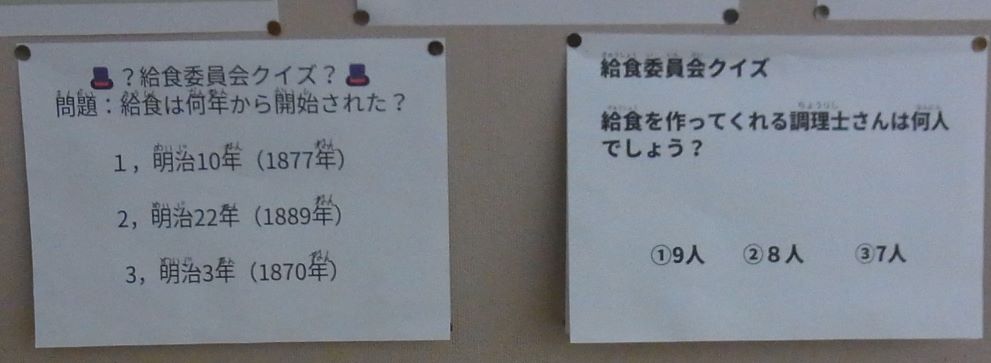 真ん中、右画像は、給食週間の掲示物の一部です。個人的には、盆汁が特に懐かしい料理です。右の画像はクイズですが、ここだけの話にしておいてほしいのですが、その右の紙をめくると、おまけがあります。そこには、調理員さんの紹介とともに、それぞれのおすすめの給食メニューがあります。作っている人のおすすめですので、説得力があります。どんなものが挙げられていたか、お子様に聞いてみてくださいね。