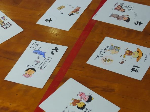 今日は2年生が船江老人会様のお世話になりカルタ大会をしています。ただのカルタではありません。「おおきんな」「だんないよ」「かいだりーなー」など伊勢弁のカルタで、素敵な絵は伊勢市の中学生の作によるものです。