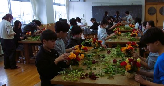 花を見ると気持ちが安らいだり、花を贈ることで気持ちが伝わったり・・・花がある生活はよいものです。今日は6年生が花育の学習です。