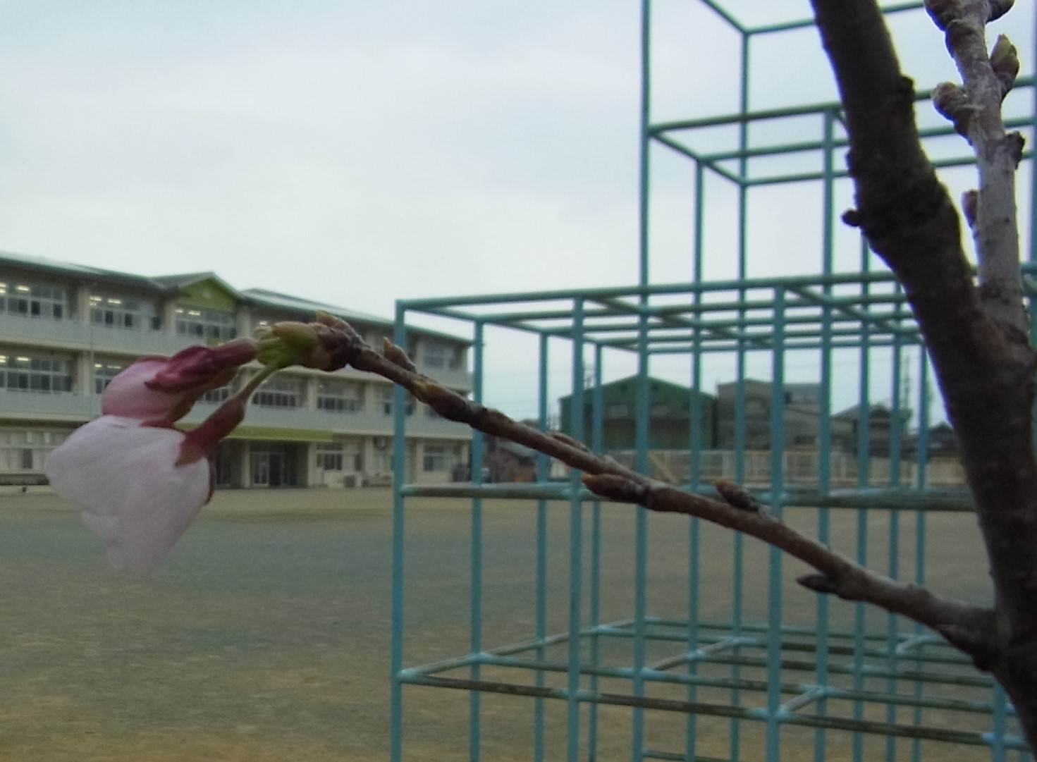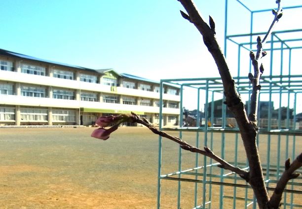 校庭では、左画像のように桜も咲き始めました。真ん中画像は、アルミ缶回収の感謝の植樹の桜のつぼみが膨らみ始めている様子です。無事つぼみは付きましたが、開花はあと2〜3日かかるかもしれません。春ですね。明日は修了式と離任式があります。春は別れの季節です。