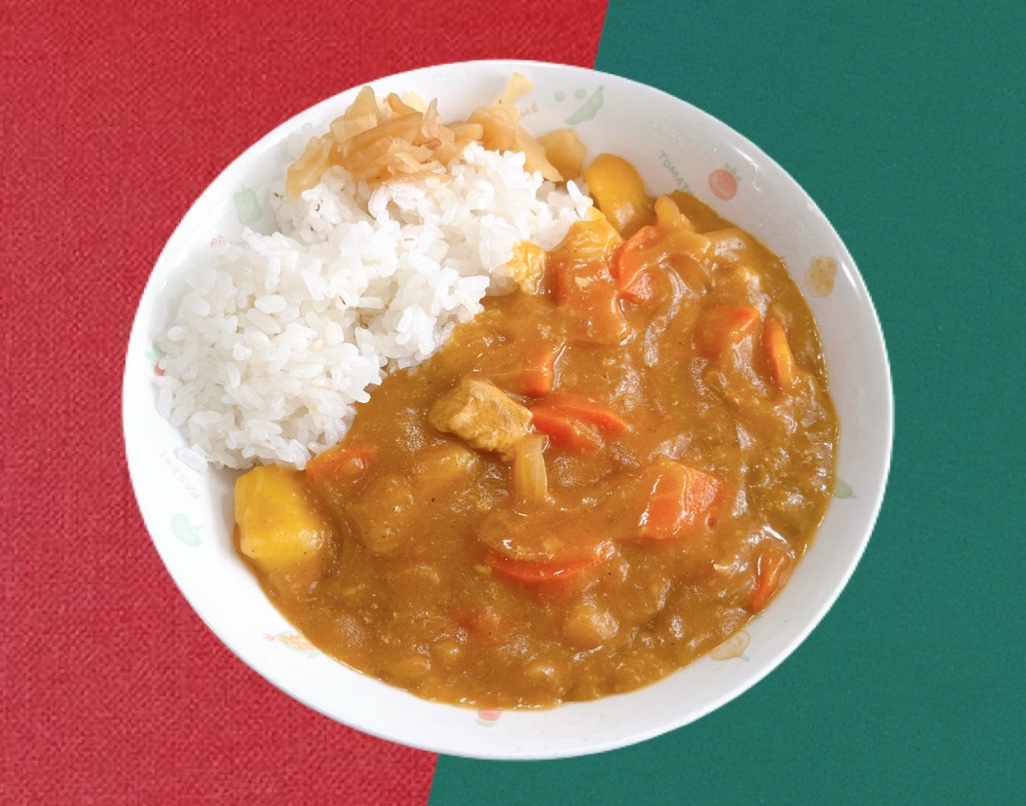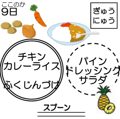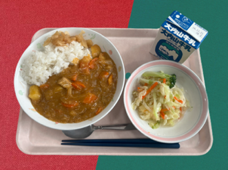 ●チキンカレーライス、福神漬け、牛乳、パインドレッシングサラダ