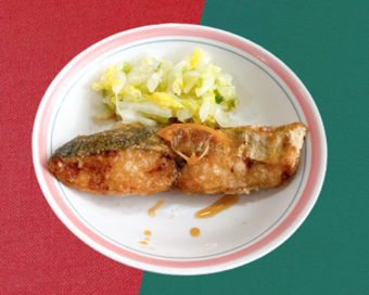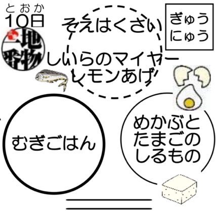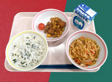 ●麦ごはん、牛乳、シイラのマイヤーレモン揚げ、添え野菜、めかぶとたまごの汁物