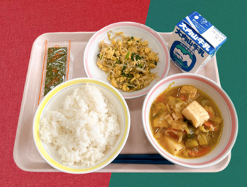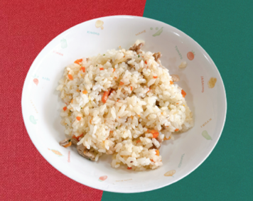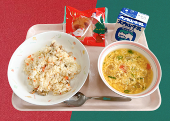 ●ポークピラフ、牛乳、冬野菜のぽかぽかたまごスープ、お楽しみデザート