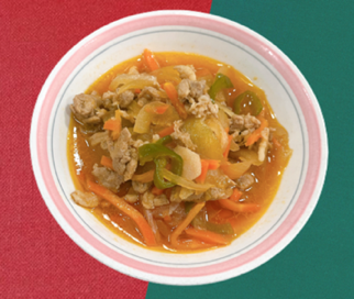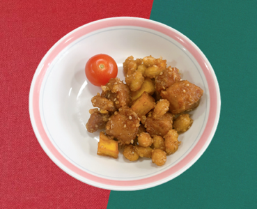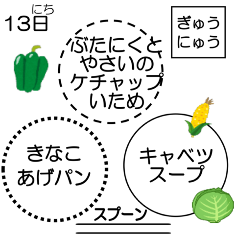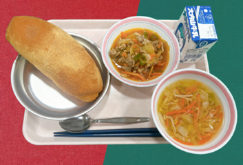 ●きなこ揚げパン、牛乳、豚肉と野菜のケチャップ炒め、キャベツスープ