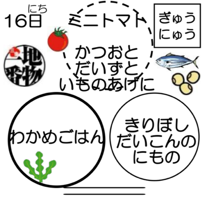 ●わかめごはん、牛乳、鰹と大豆といもの揚げ煮、切り干し大根の煮物