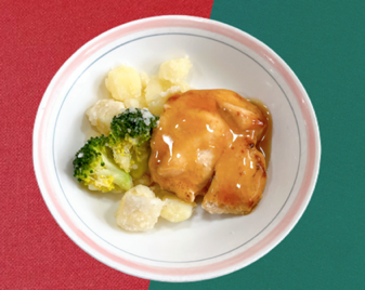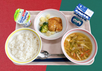 ●麦ごはん、牛乳、鶏肉の照り焼き、温野菜、白菜汁