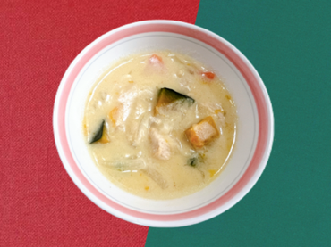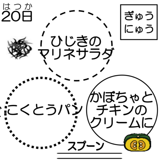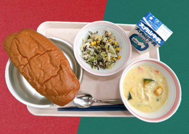 ●黒糖パン、牛乳、かぼちゃとチキンのクリーム煮、ひじきのマリネサラダ