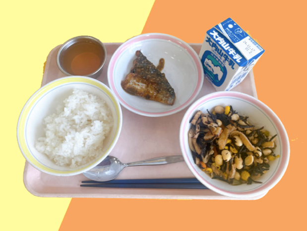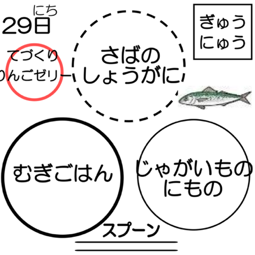 ●麦ごはん、牛乳、鯖の生姜煮、じゃがいもの煮物、手作りりんごゼリー
