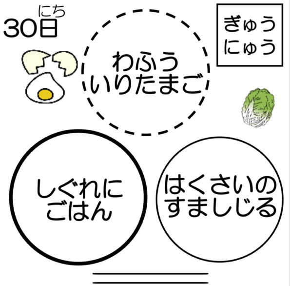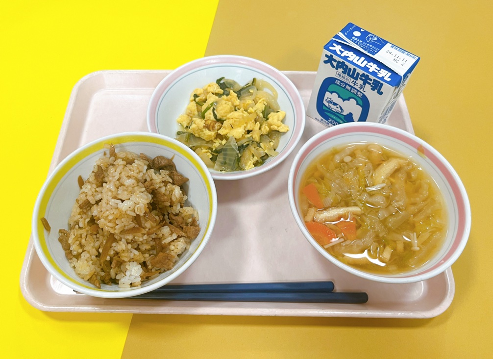 ●しぐれ煮ごはん、牛乳、和風いりたまご、白菜のすまし汁