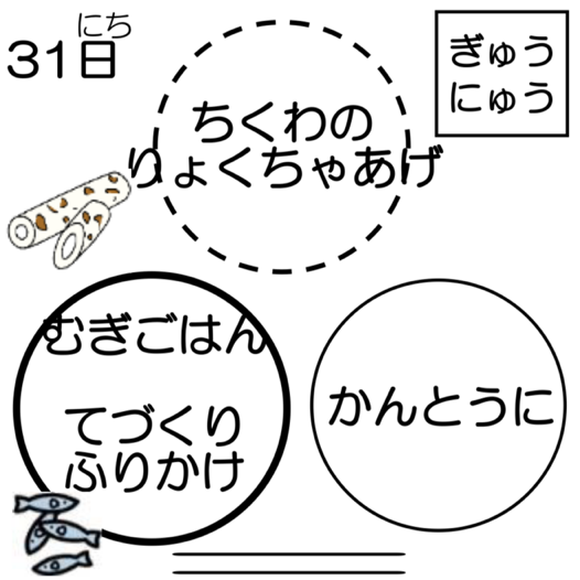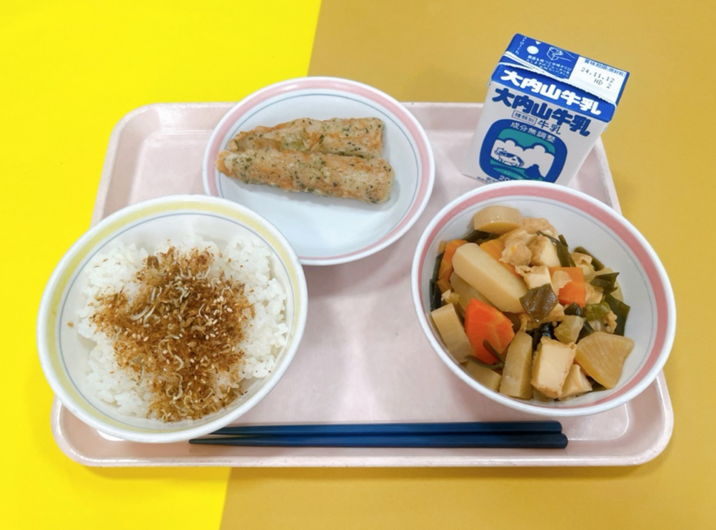 ●麦ごはん、手作りふりかけ、牛乳、ちくわの緑茶揚げ、関東煮