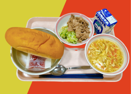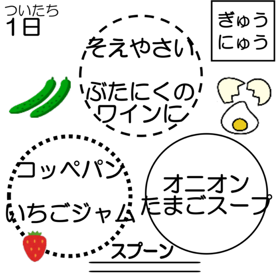 ●コッペパン、いちごジャム、牛乳、豚肉のワイン煮、添え野菜、オニオンたまごスープ