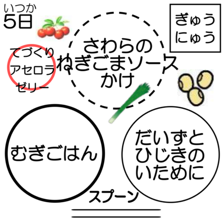 ●麦ごはん、牛乳、鰆のねぎ胡麻ソースかけ、大豆とひじきの炒め煮、手作りアセロラゼリー