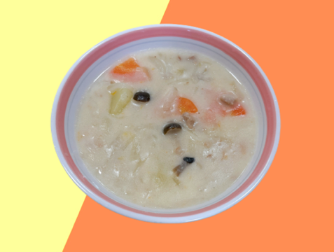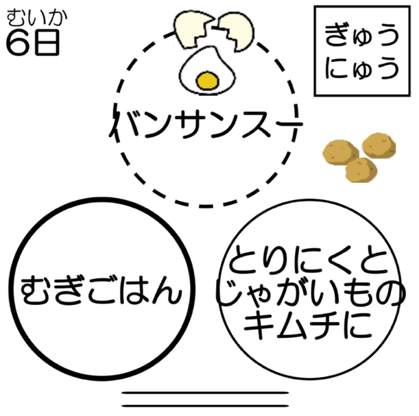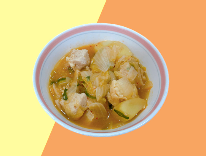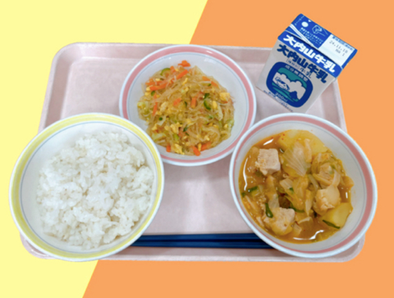 ●麦ごはん、牛乳、鶏肉とじゃがいものキムチ煮、バンサンスー