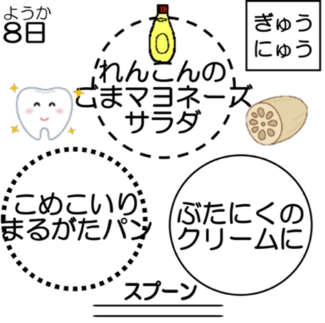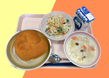 ●米粉入り丸型パン、牛乳、豚肉のクリーム煮、れんこんの胡麻マヨネーズサラダ