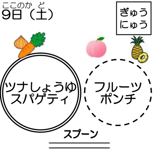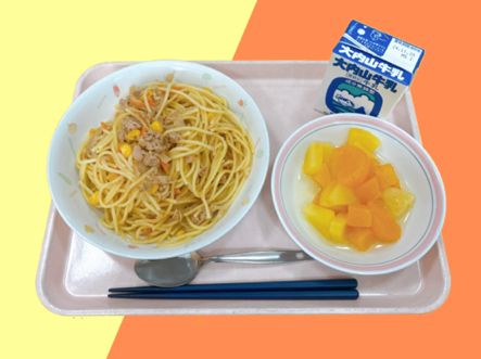 ●ツナ醤油スパゲッティ、牛乳、フルーツポンチ